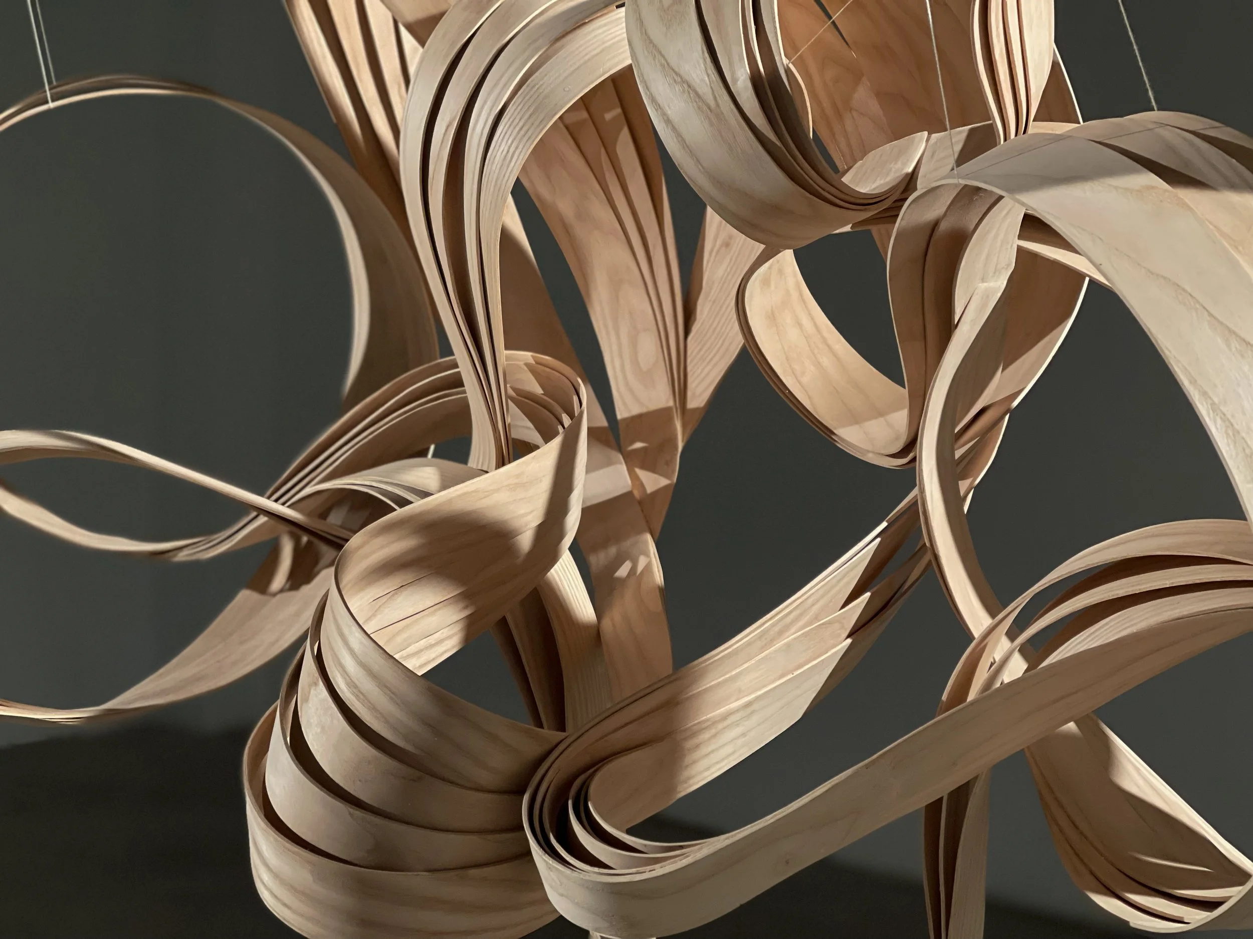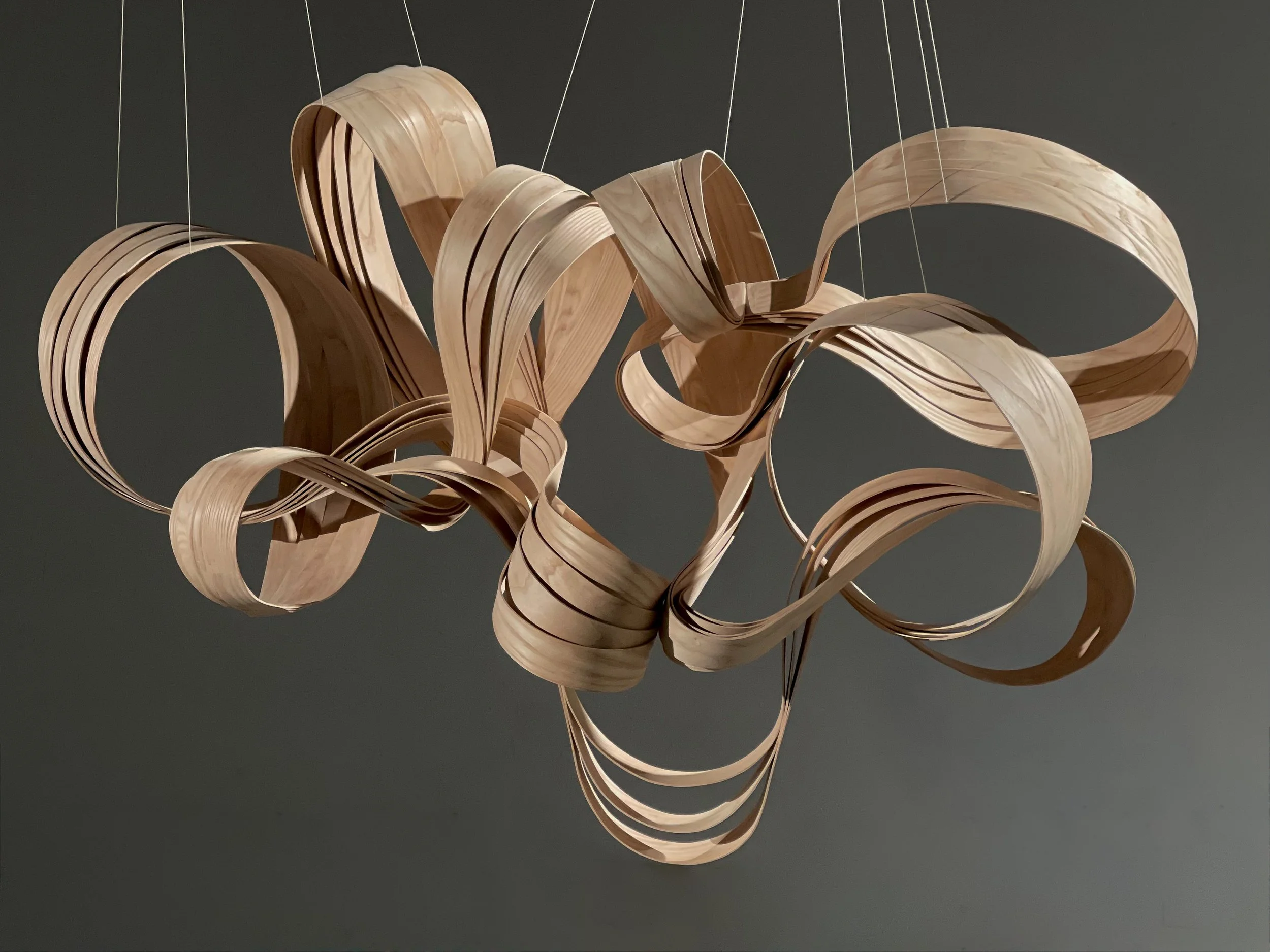 This sculpture was created through freeform bending on a luthier's pipe. Each strip of veneer was handmade, so that I could control the thickness, width, and length to account for the variety of curves. As they were bent, I worked intuitively and experimented with different twists and turns. The strips were then laminated together and blended out at each seam to appear as one seamless line.